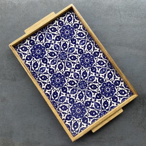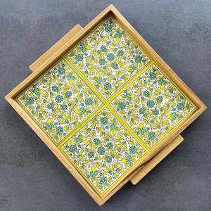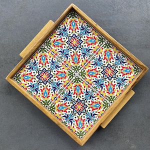 This tray is artfully crafted from wood and embellished with ceramic tiles. It's perfect as a decorative item or for serving coffee and cake. It also makes a lovely gift for birthdays or housewarmings.